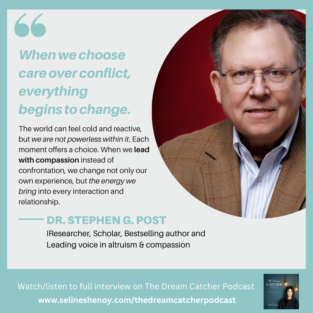 In this episode, Seline Shenoy speaks with Dr. Stephen G. Post — researcher, scholar, bestselling author, and a leading voice in the science of altruism, compassion, and wellbeing. His work bridges science, psychology, medicine, and spirituality to explore how love, kindness, and giving can improve mental health, emotional resilience, and overall wellbeing.