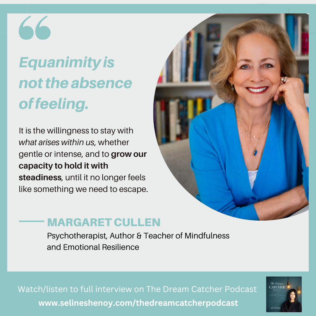 In this episode, Seline Shenoy speaks with Margaret Cullen — mindfulness teacher, psychotherapist, and a pioneer in bringing contemplative practices into mainstream spaces. With decades of experience, Margaret shares a deeper understanding of equanimity, a theme she explores in her book Quiet Strength.