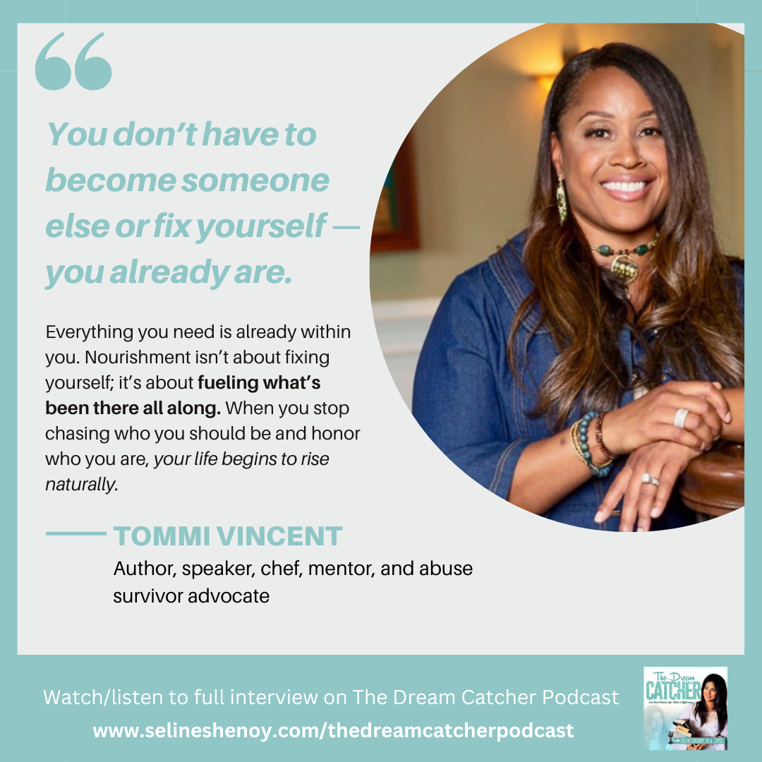 In this episode of The Dream Catcher Podcast, Seline Shenoy speaks with Tommi A. Vincent, also known as Chef Tommi V — culinary storyteller, wellness advocate, speaker, and author of The Table of Life: Nourishing the Soul with Food, Love, and Faith. Tommi’s work blends food, faith, family legacy, and personal healing into a powerful message about what it truly means to nourish the soul.